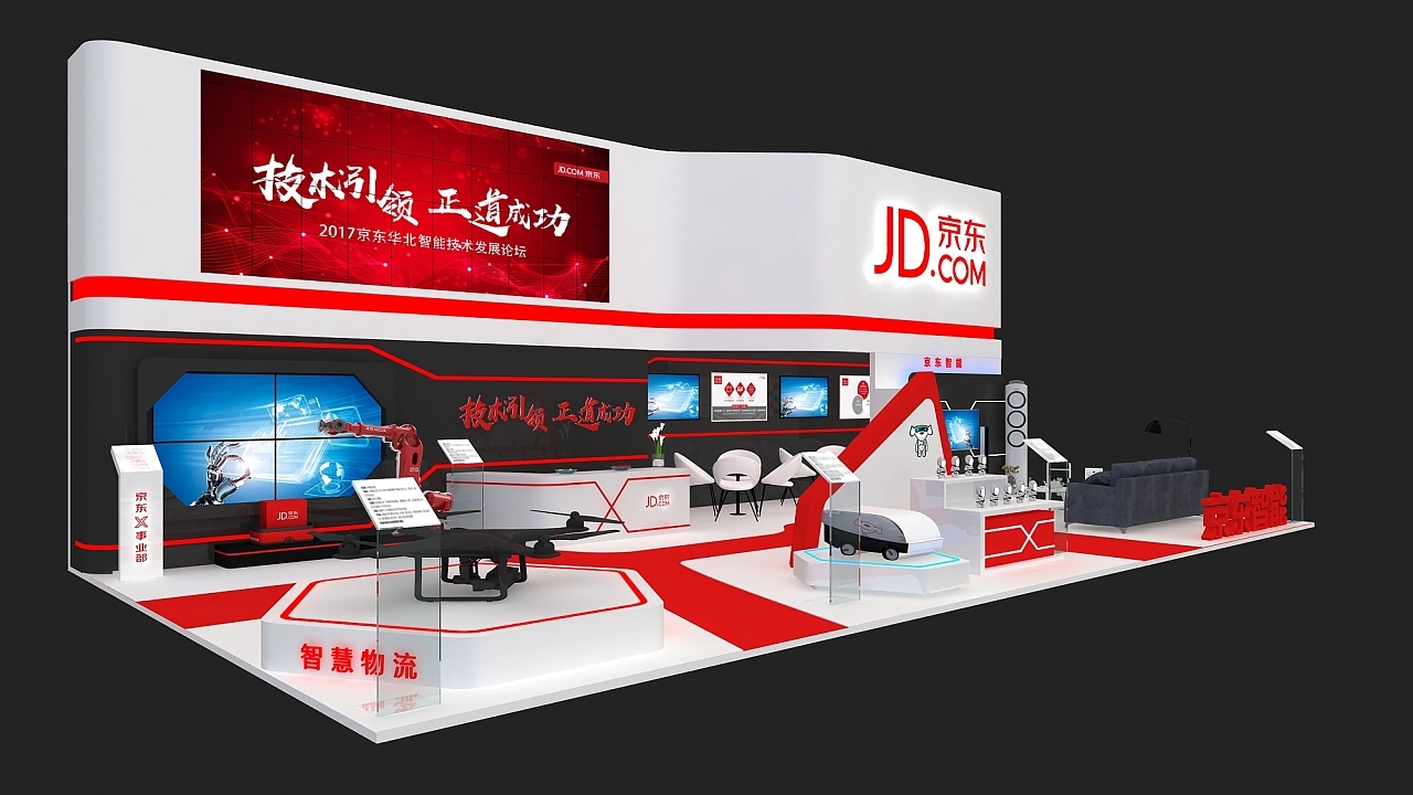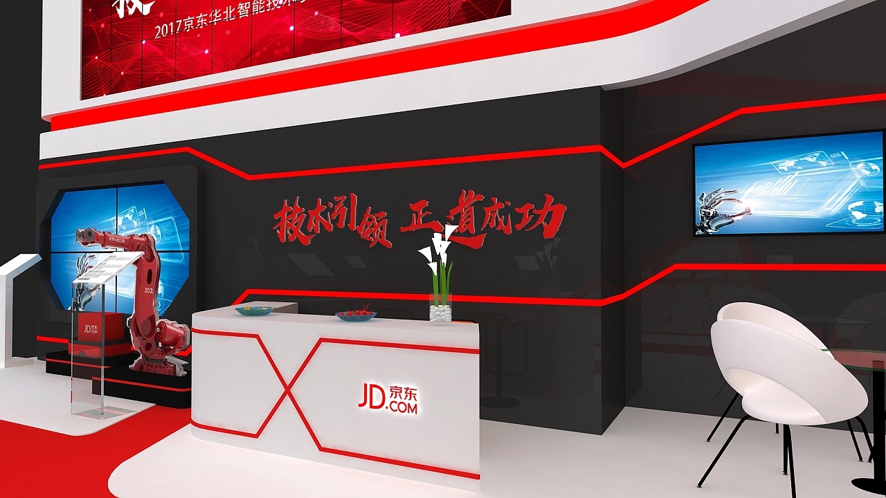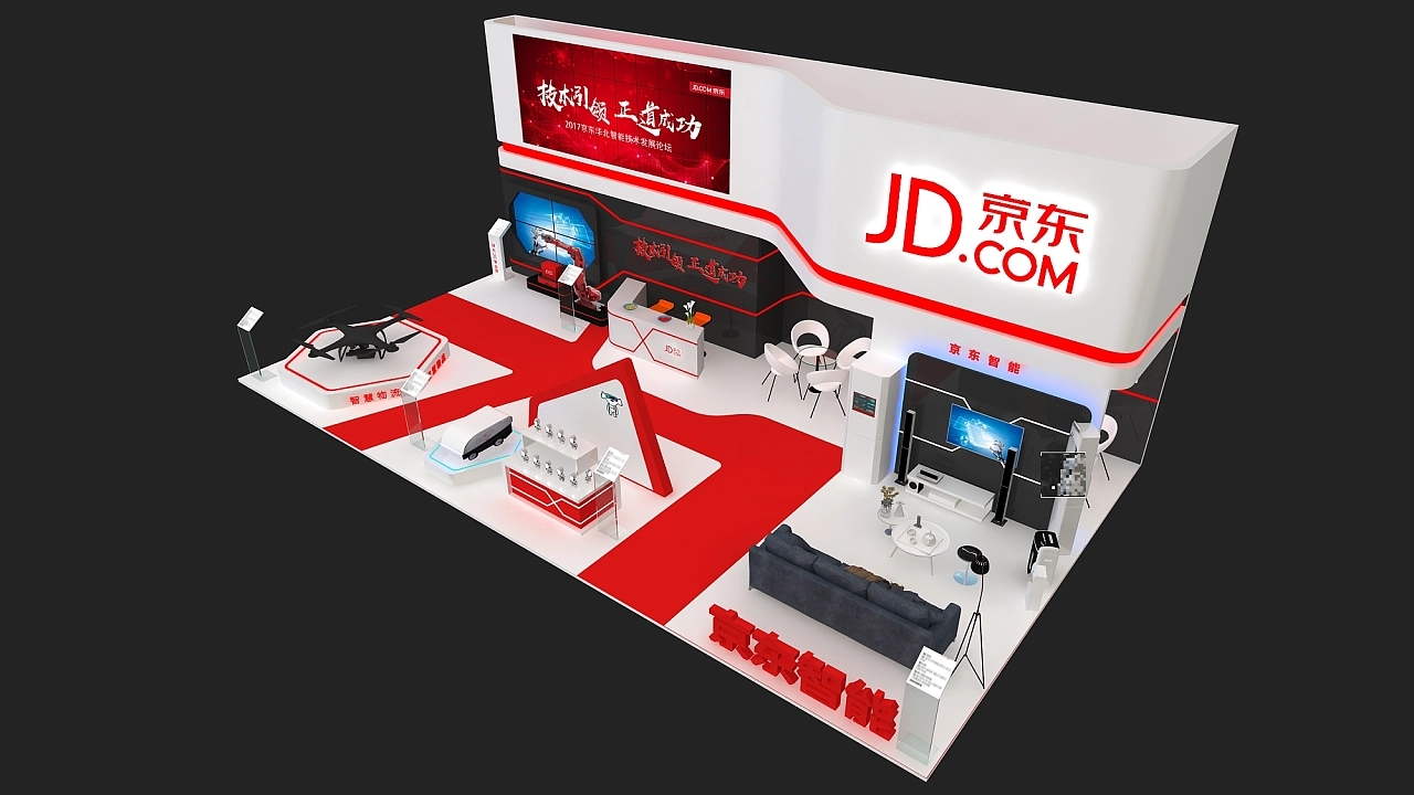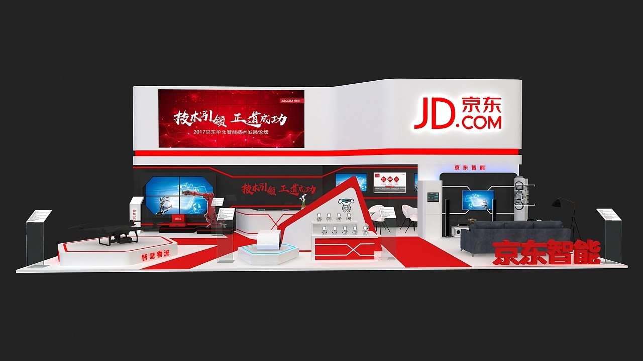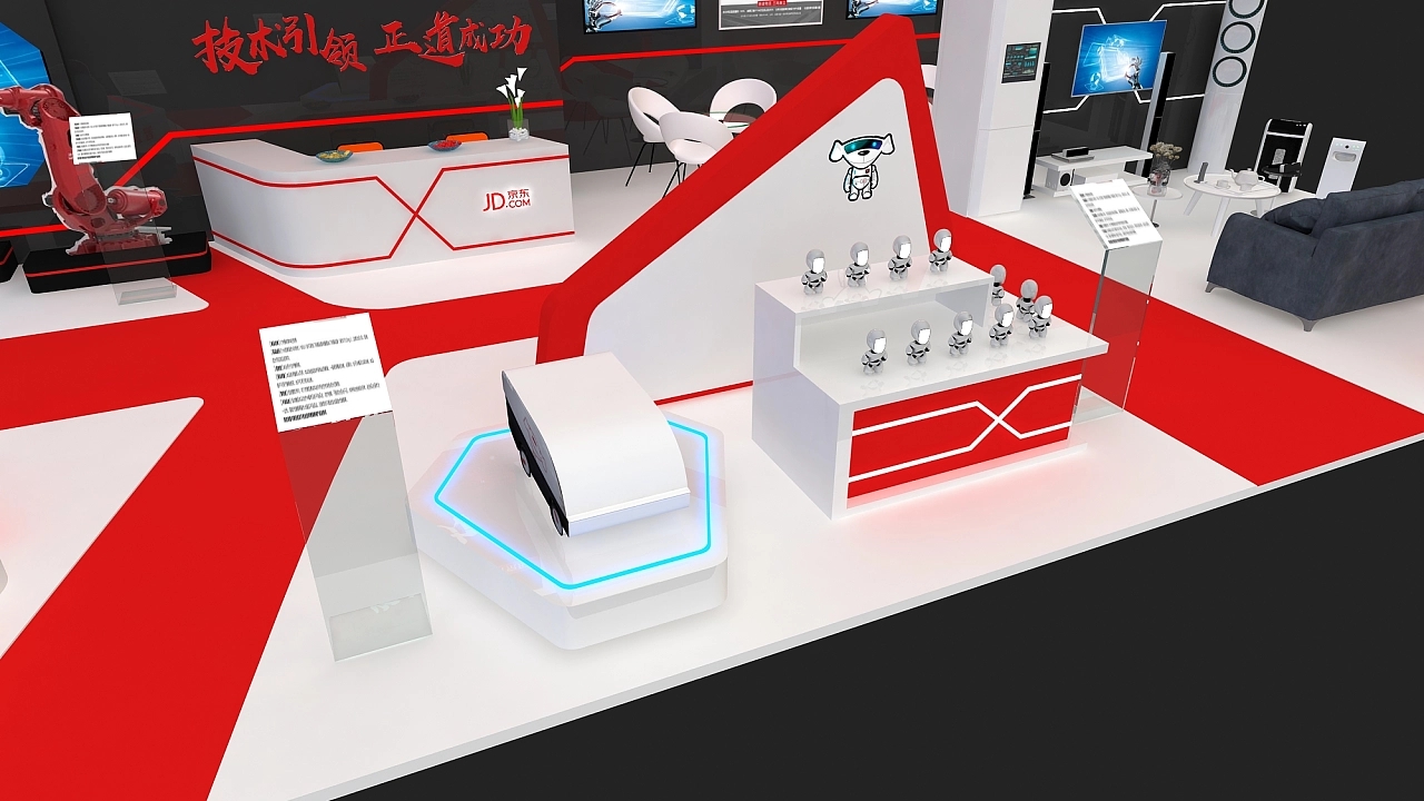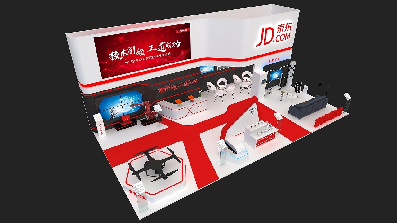 展臺設計搭建面積為180平方米,展臺設計采用了京東logo的紅色作為亮點色與白色進行搭配,地面用紅色將展位按不同功能區進行劃分,將展示的產品與功能分區域進行布置搭建,整個展臺設計十分簡潔明了,有利于參展觀眾對感興趣的產品進行瀏覽,促進合作。