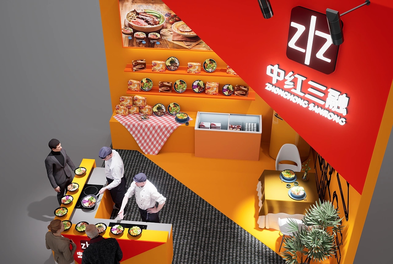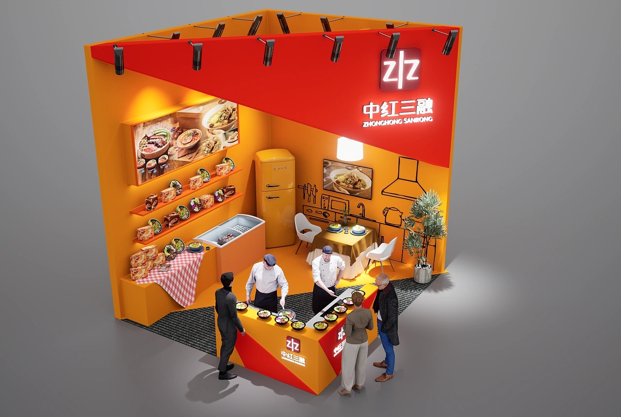 該展臺搭建面積為36平方米,展臺設計使用了紅色和橙色作為主色彩,視覺效果十分亮眼吸睛,后方搭配了高清燈箱以及展示架,還有兩種冰箱用于儲存展示的產品。該展臺前臺接待區布置了四個電磁爐,方便客戶感受預制菜產品的便捷以及味道,促進訂單成交量的提升。