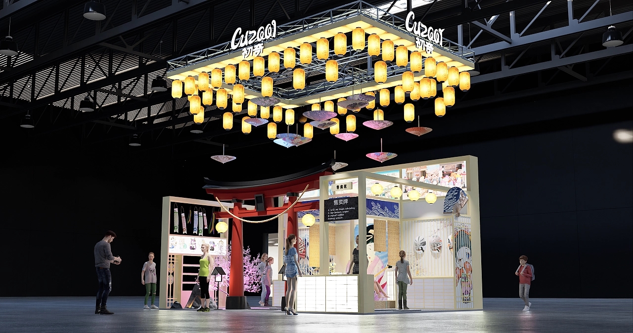 展臺設計搭建面積為56平方米,展臺設計風格使用了日式和風,在展位搭建上方懸掛了日式燈籠和傘,展臺前方搭建了一個鳥居,讓展會觀眾仿佛來到動漫中的廟會當中。背面還布置了兩個大型海報以及三個展示櫥窗,使得來往的參展觀眾能被海報內容所吸引。