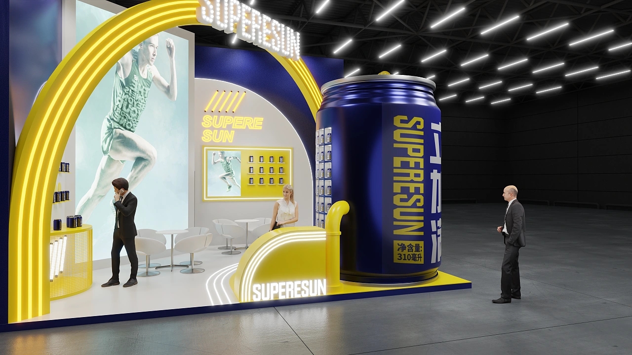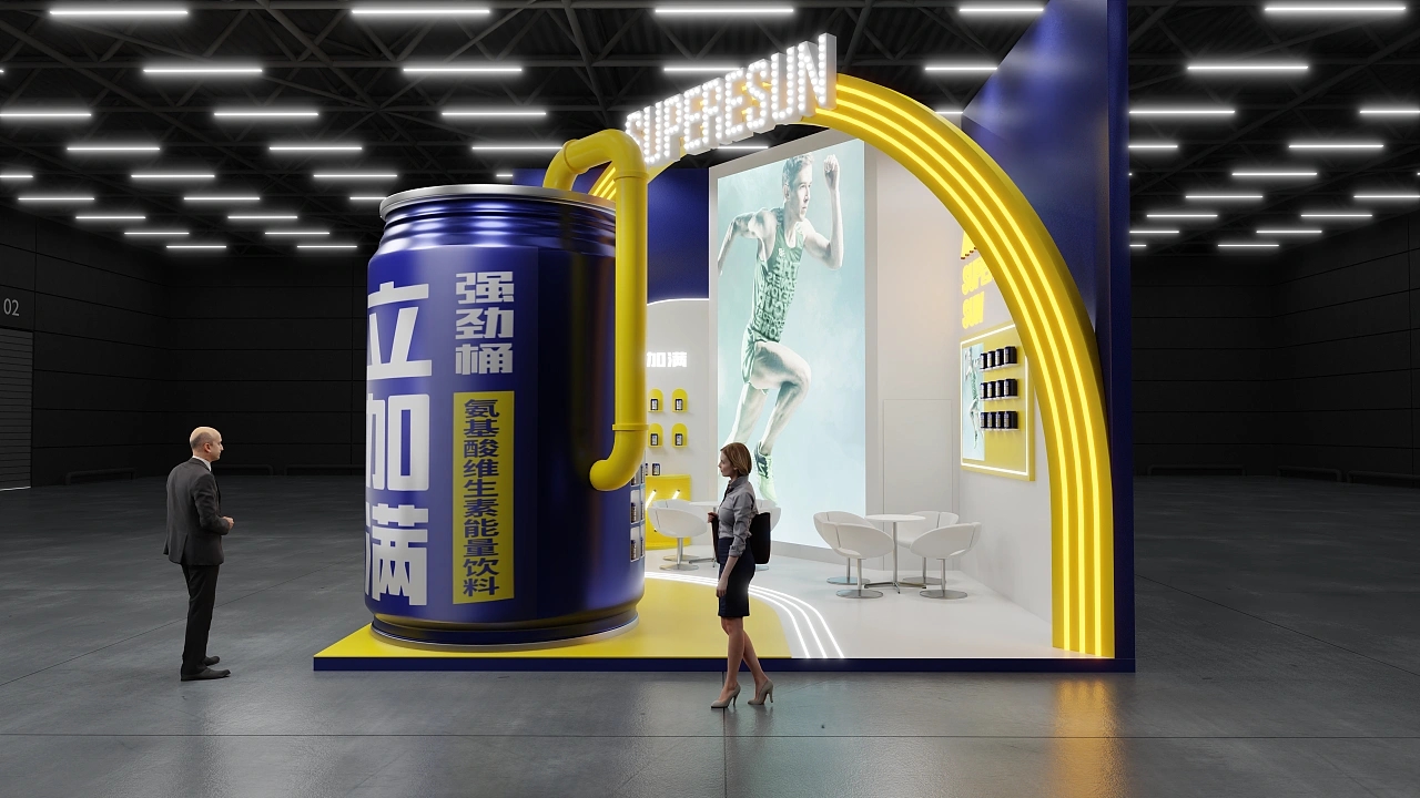 展臺設計要怎么打造企業特色展臺,是很多企業都想要解決的問題。該展臺設計搭建結合了該企業主打產品的外形與運動元素進行設計,在展臺前方搭建了一個巨型的產品模型,能快速抓取來往的會展觀眾的視線,打造成該展臺設計的焦點。整個展臺采用產品使用的藍色和黃色進行色彩搭配,展臺立面墻上搭建了較高的軟膜燈箱,用于展示該企業的文化,促進產品的宣傳。