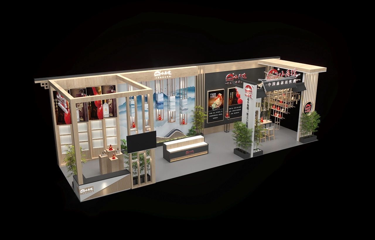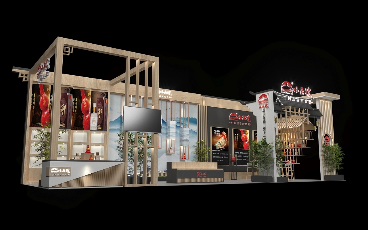 該展臺設計采用了中式的設計風格,在展臺搭建上使用了木質結構框架,造型上除了木質背景,還選用了中式灰墻白瓦,搭配綠色的竹子,打造了一個中式設計風格的展臺。客戶洽談區內布置搭建了燈箱海報,對產品進行宣傳,有利于促進與客戶的合作,提高產品訂單的成交量。